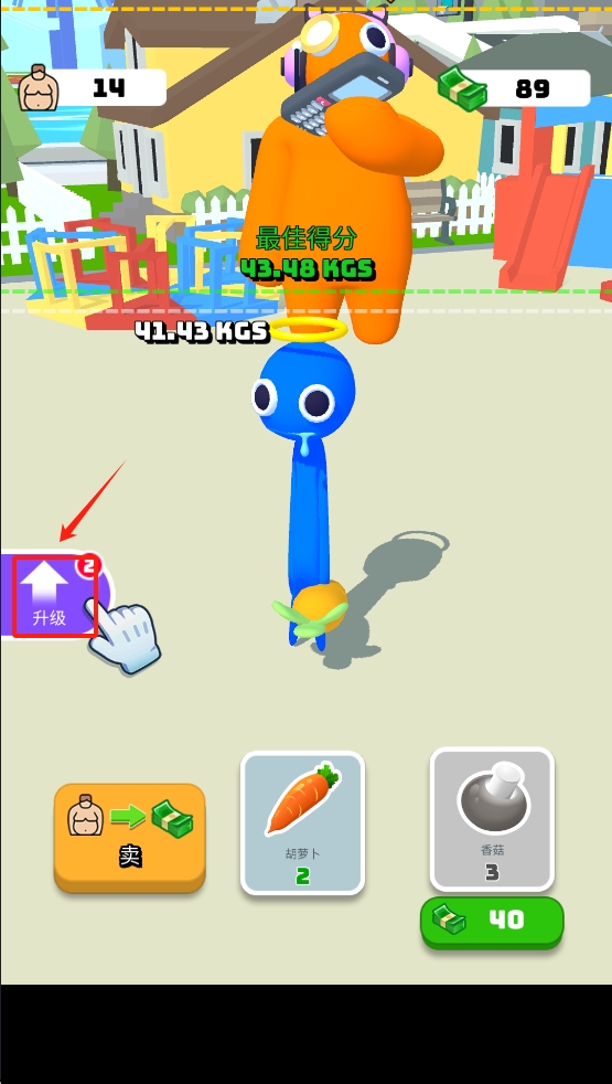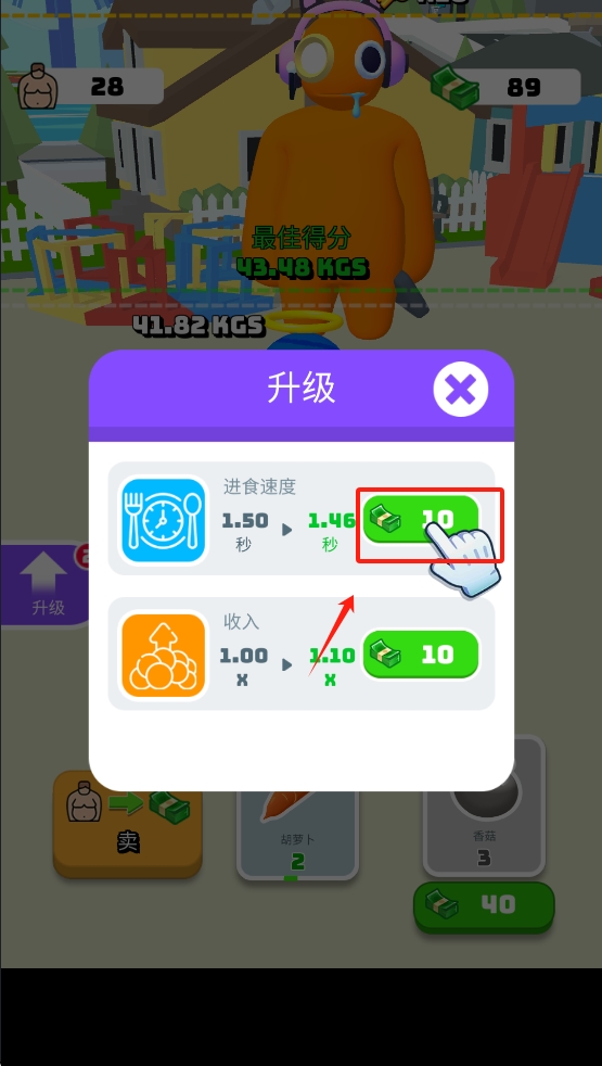 2、游戏进行中,点击左下角的升级按钮,可以提升角色的进食速度和收入。