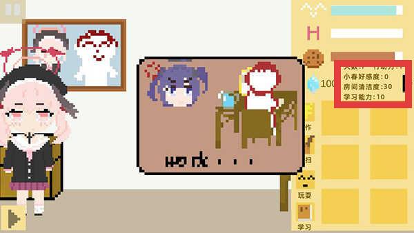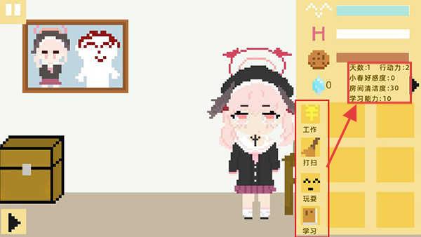 1、关注界面右侧的【天数】【行动力】【小春好感度】【房间清洁度】【学习能力】等数值,这些是游戏的关键状态信息。