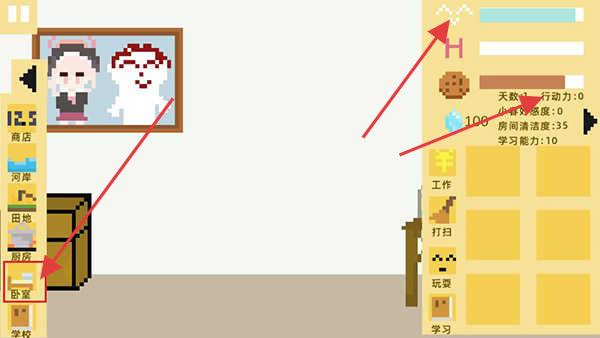 2、左侧有【商店】【河岸】等地点选项,点击不同地点可能会影响游戏内的状态,如点击【卧室】可提升【房间清洁度】和【行动力】。