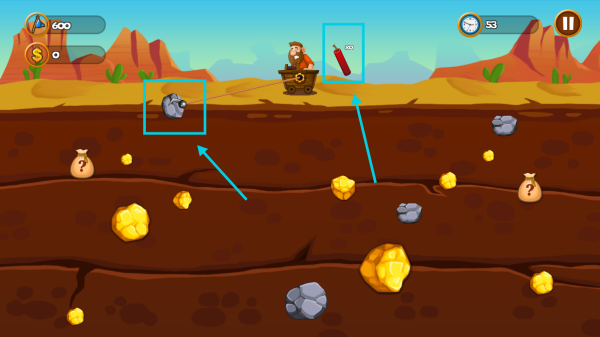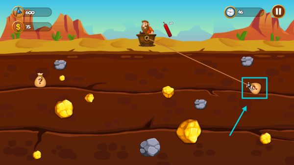 2、矿工工具的抓钩会持续不断来回摇摆,玩家需要看准时机点击屏幕即可往当前方向释放抓钩,抓到石头时需要耗费较长时间拉取,且获益甚少,可以点击炸药道具将其炸毁,以此节省时间重新抓取。