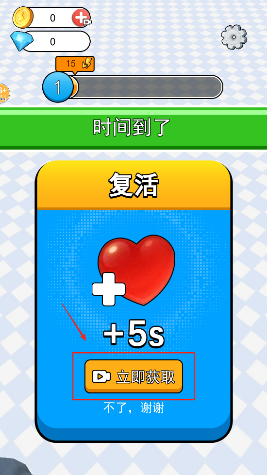 3、当时间耗尽时,可以选择观看广告来复活并继续游戏,增加5秒游戏时间。