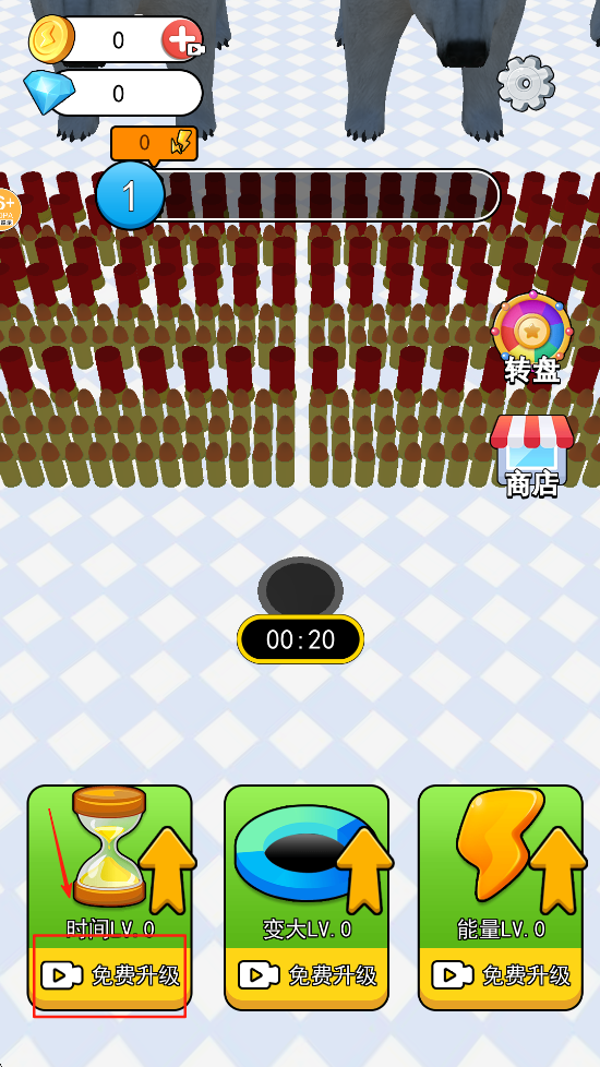 1、开始游戏后,进入一个有时间限制的合成挑战,点击“免费升级”提升能力。
