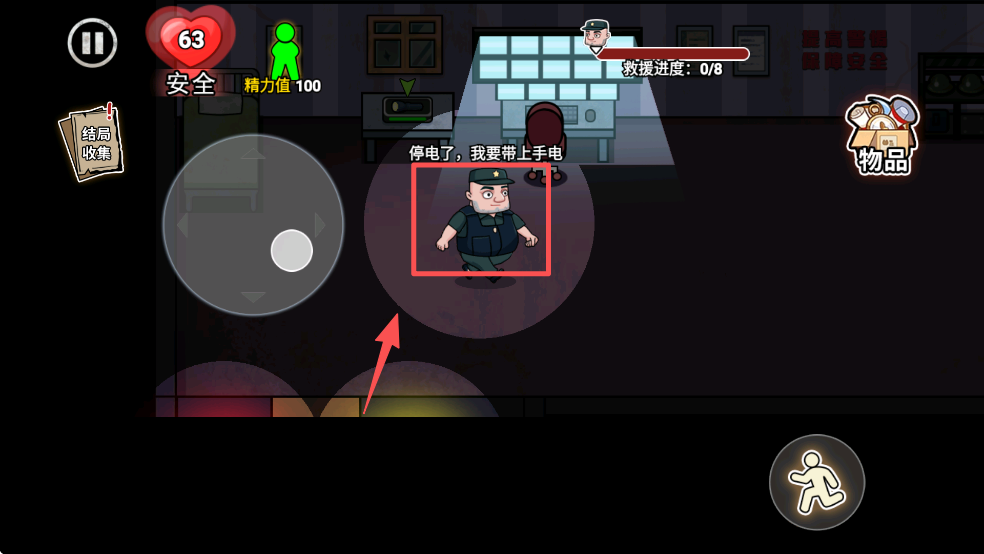 4、在游戏进行中,根据提示进行操作,例如点击手电筒图标,模拟保安工作。