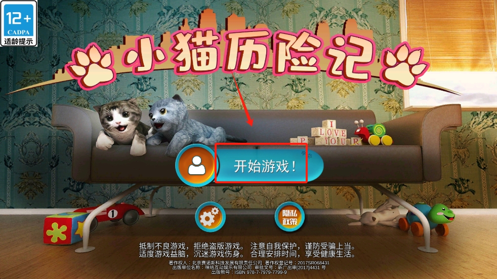 1、在游戏主界面,点击下方 “开始游戏” 按钮,开启猫咪冒险之旅。