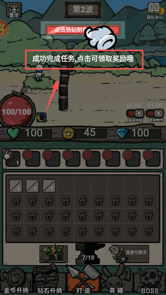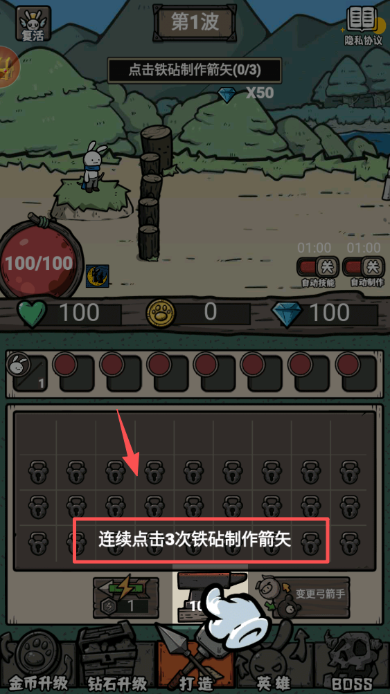 1、点击铁砧制作箭矢,连续点击3次以完成制作任务。