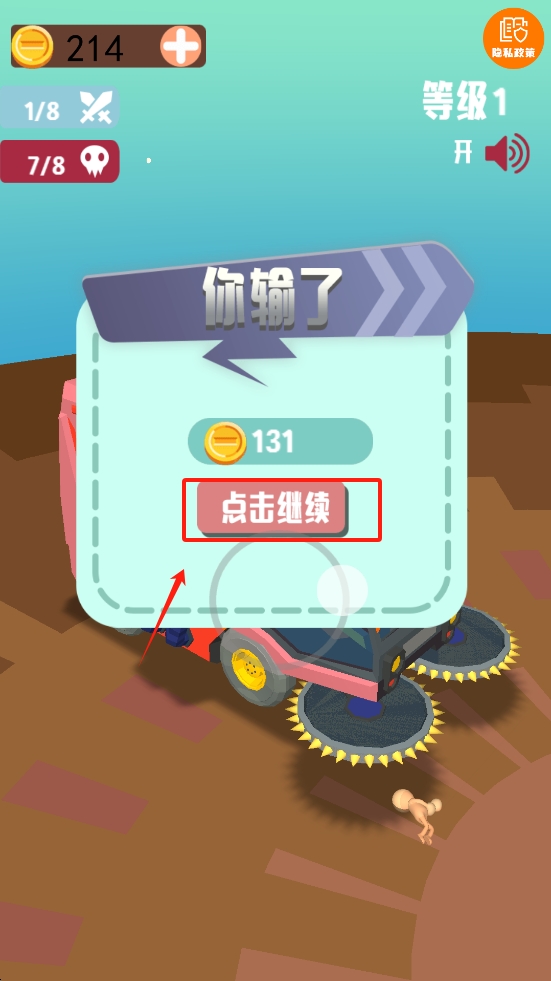 4、如果被敌人击败,点击“点击继续”按钮重新开始。