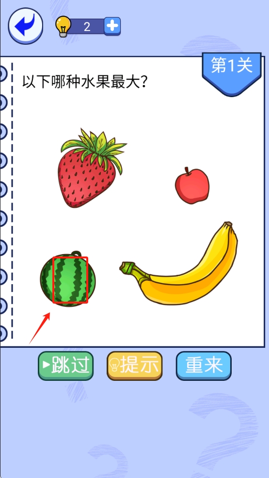 3、阅读题目“以下哪种水果最大?”后点击“西瓜”选出最大水果。