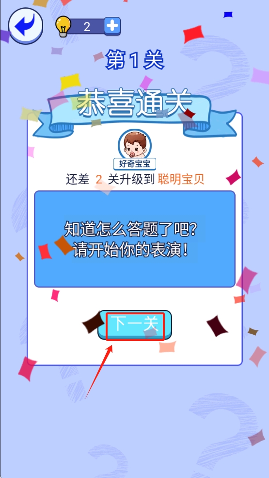 4、出现“恭喜通关”后点“下一关”,继续升级聪明宝贝。