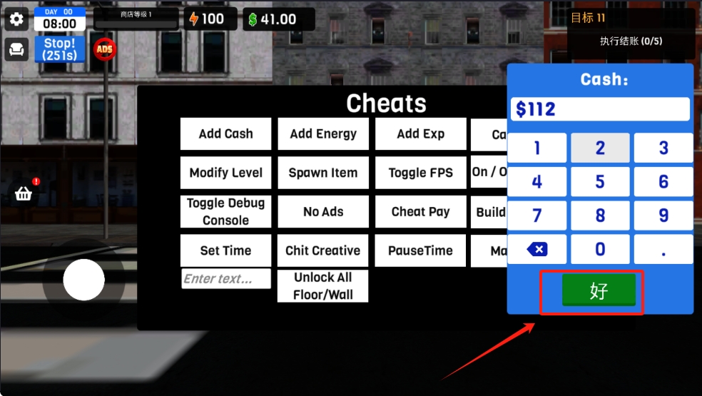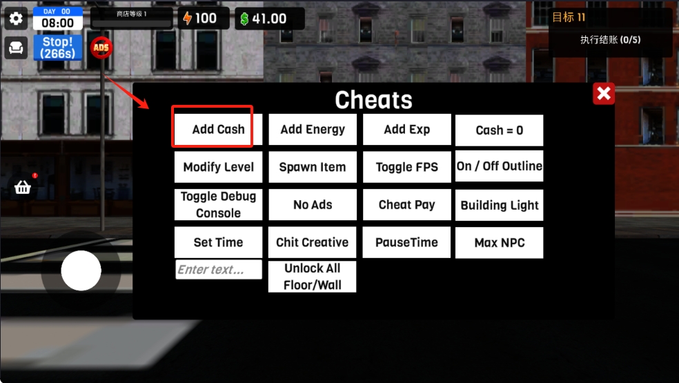 2、点击屏幕上的 “作弊” 按钮,打开作弊菜单,选择 “添加现金” 功能。