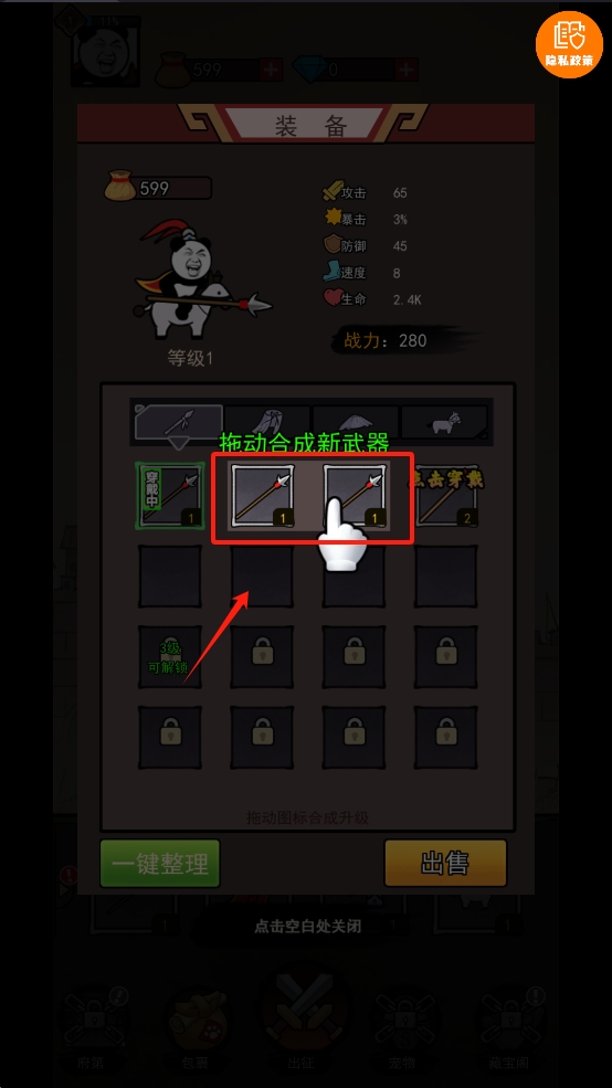 4、拖动合成新武器,利用收集的材料,制作更强的装备,为接下来的冒险做好准备。