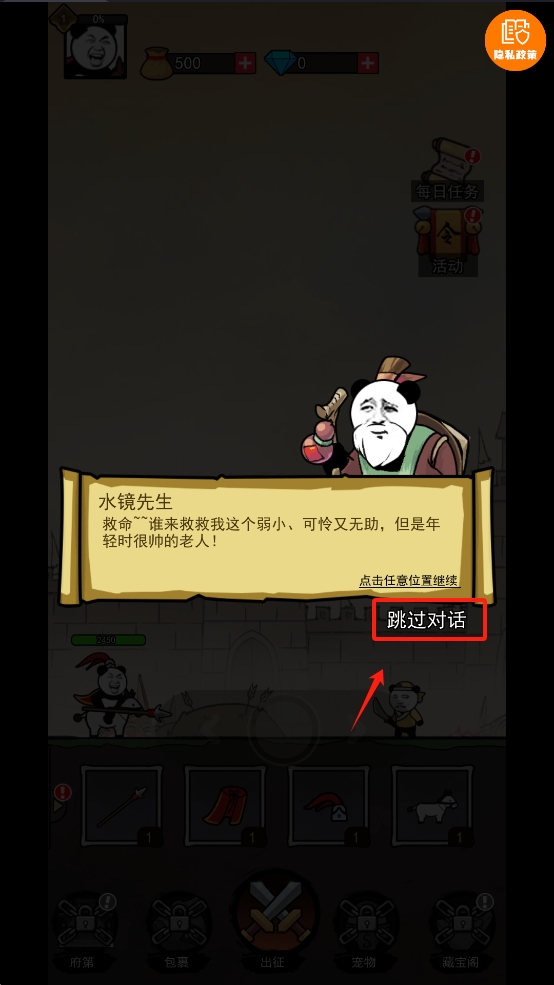 1、点击“跳过对话”按钮,快速进入游戏,开始你的冒险旅程,节省时间。