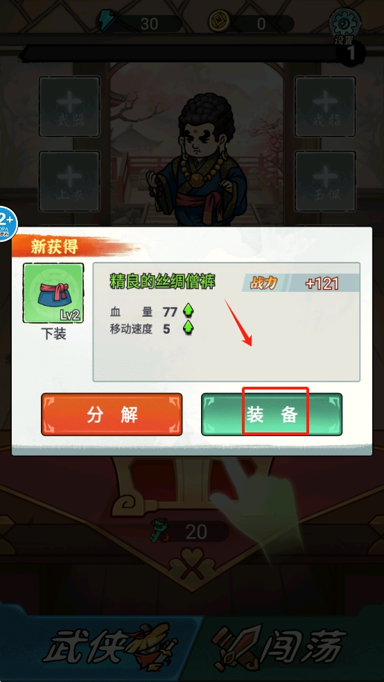 3、获取新装备后,选择 “装备” 按钮,提升战斗力。