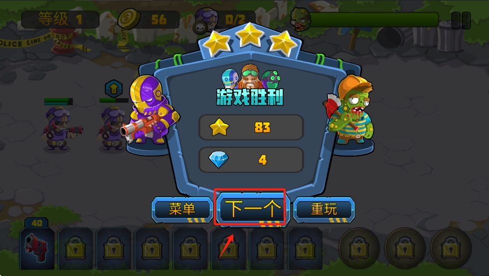 3、击败敌人后,点击“下一个”按钮,领取奖励并进入下一关。