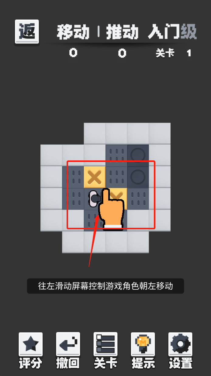 1、通过滑动控制角色移动,推动箱子到指定目标位置即可过关。