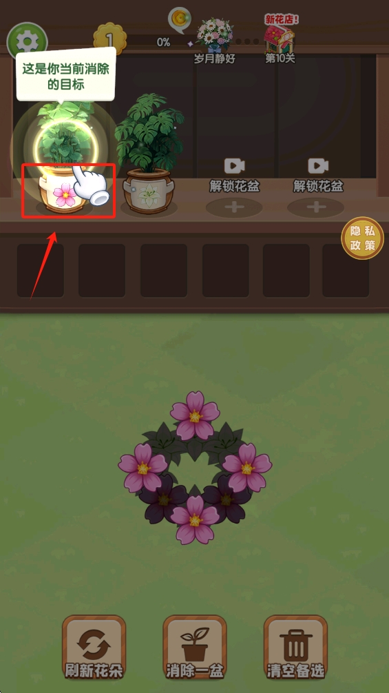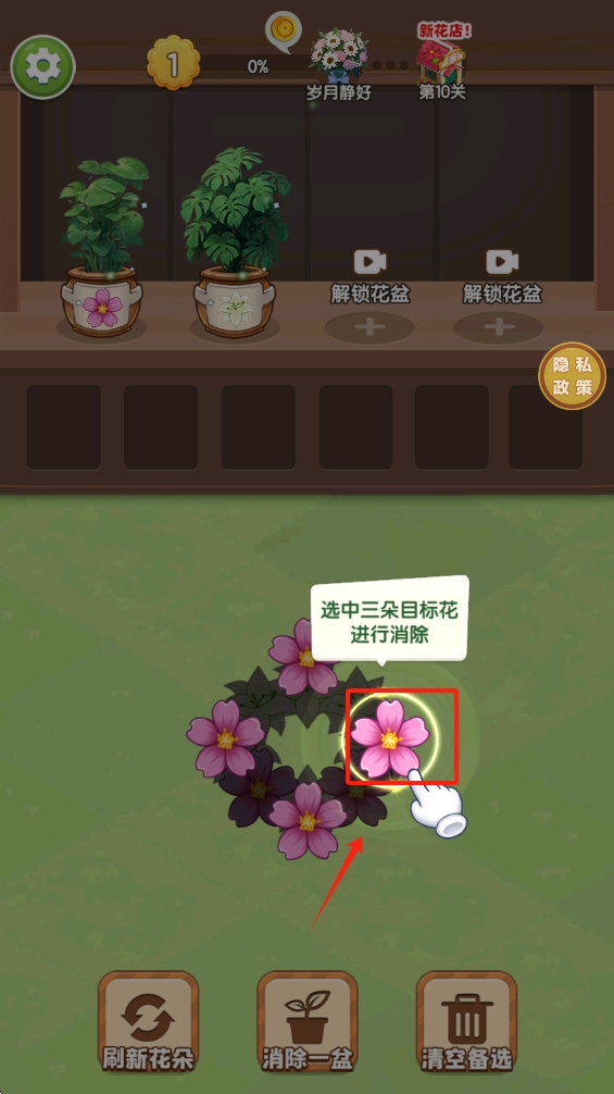 3、点击花朵即可选中,选中三朵后它们会消失,完成消除任务。