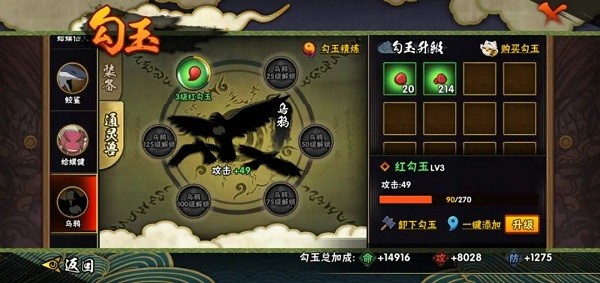 为装备与通灵兽镶嵌勾玉,并提升勾玉等级,均可提升战力。