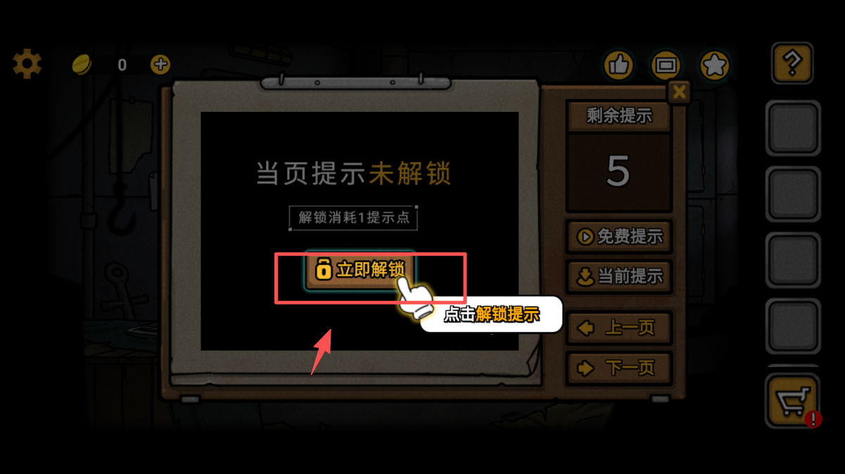 3、然后,点击“点击解锁提示”,在遇到困难时获取帮助,继续推进游戏。