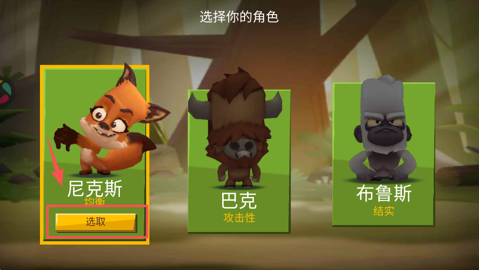 1、开始游戏时,玩家先从众多动物角色中挑选心仪的一个,每个角色具备不同技能,如尼克斯擅长敏捷偷袭,巴克偏向力量防御。