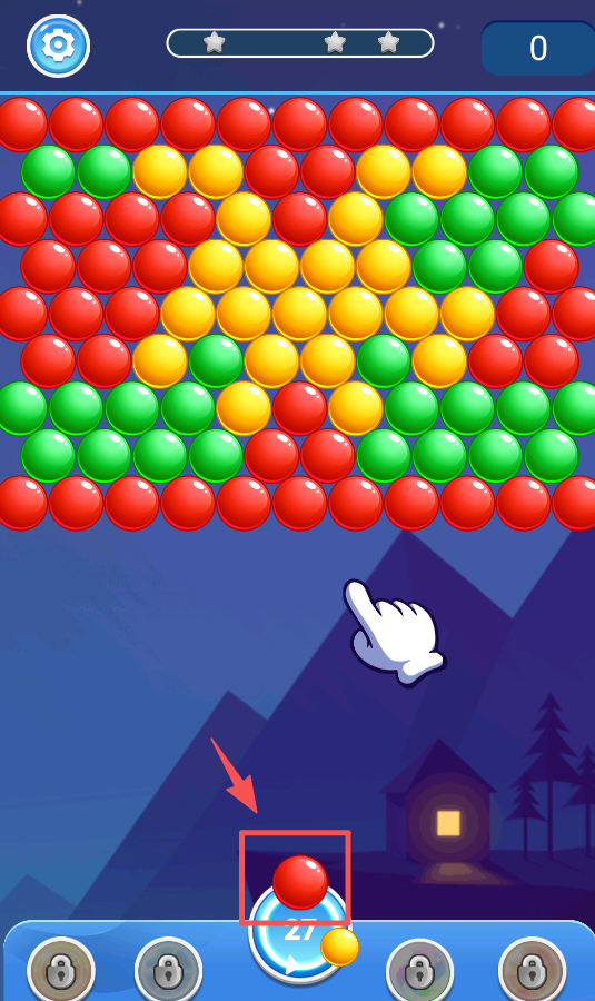 3、瞄准上方同色泡泡区域,发射下方的泡泡进行消除。