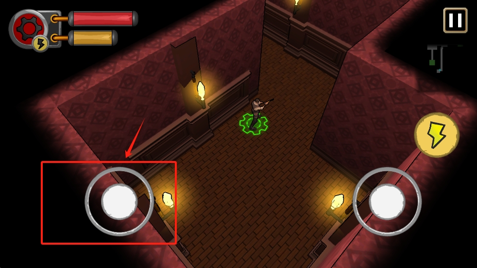3、在游戏中,使用虚拟摇杆控制角色移动,点击射击按钮进行攻击。