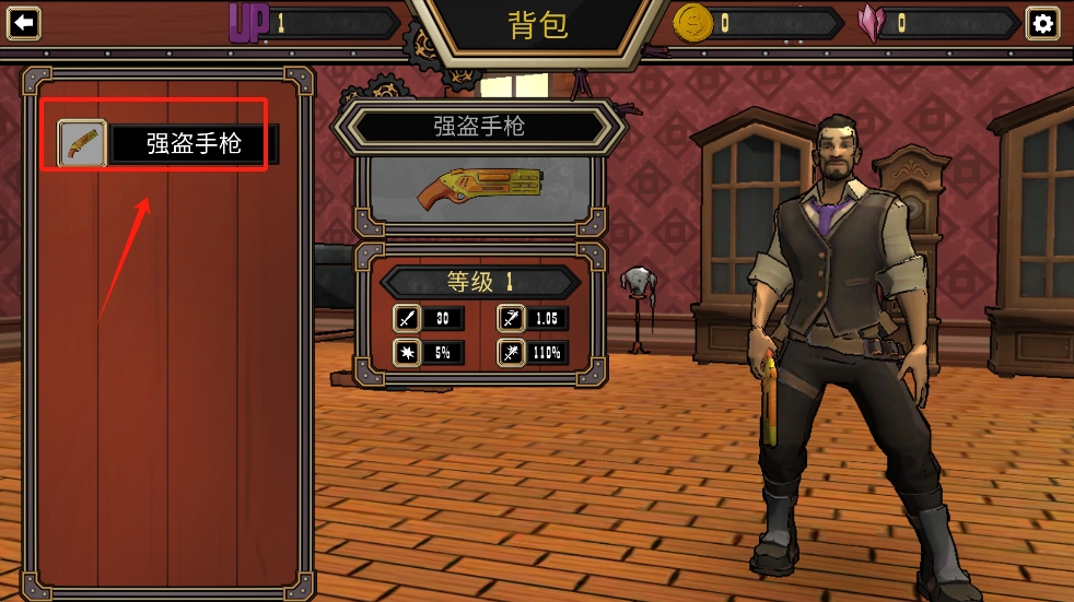 1、打开背包界面,选择“强盗手枪”并装备,准备战斗。