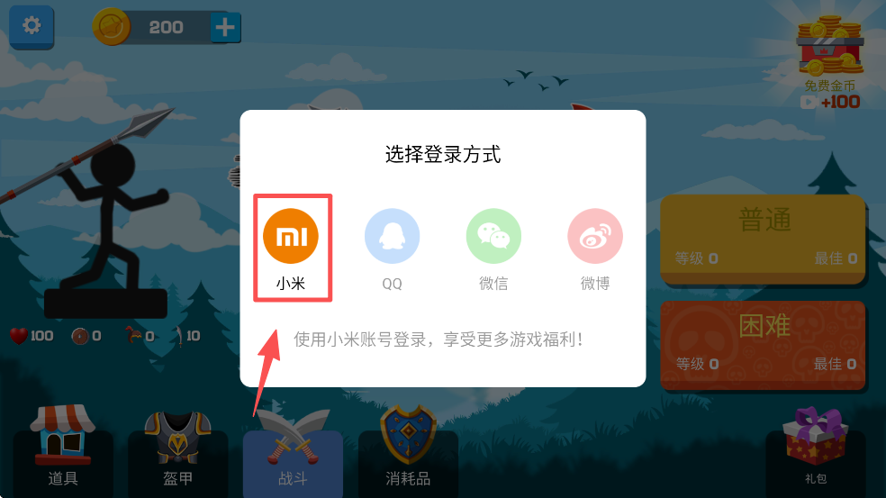 1、点击弹出的登录选项,如“小米”账号,享受更多游戏福利。