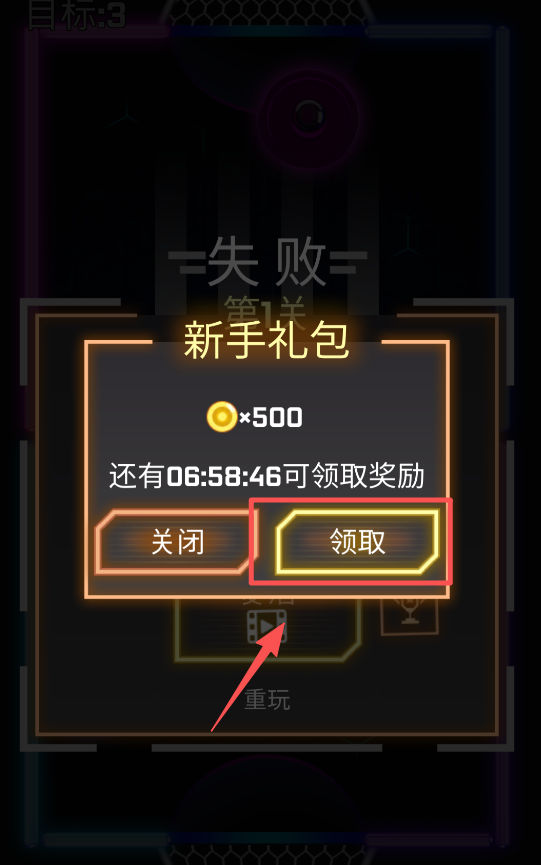 4、如果失败,领取“新手礼包”奖励继续游戏。