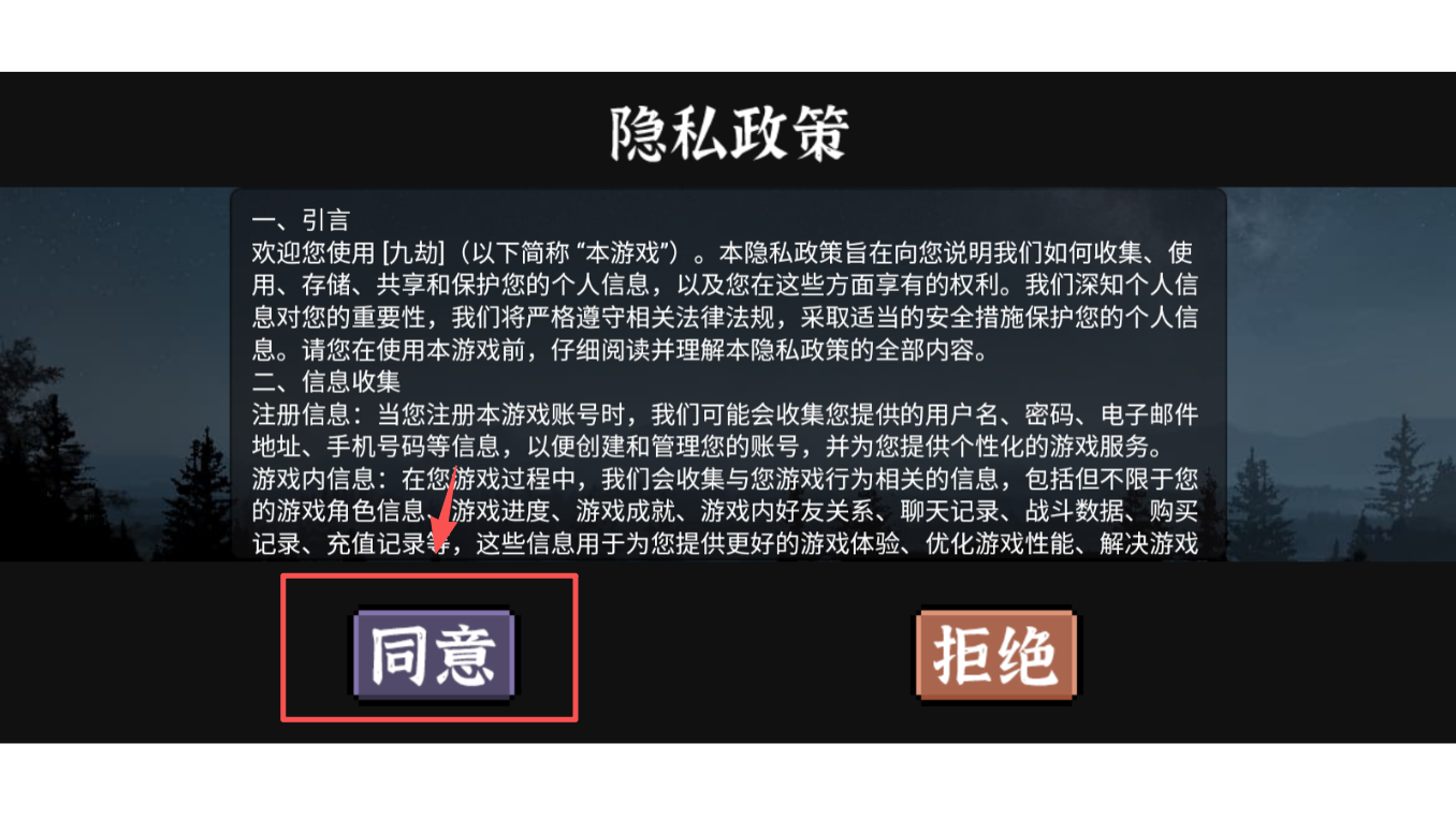 1、首先,阅读并同意隐私政策,点击“同意”按钮,以接受条款并继续游戏。