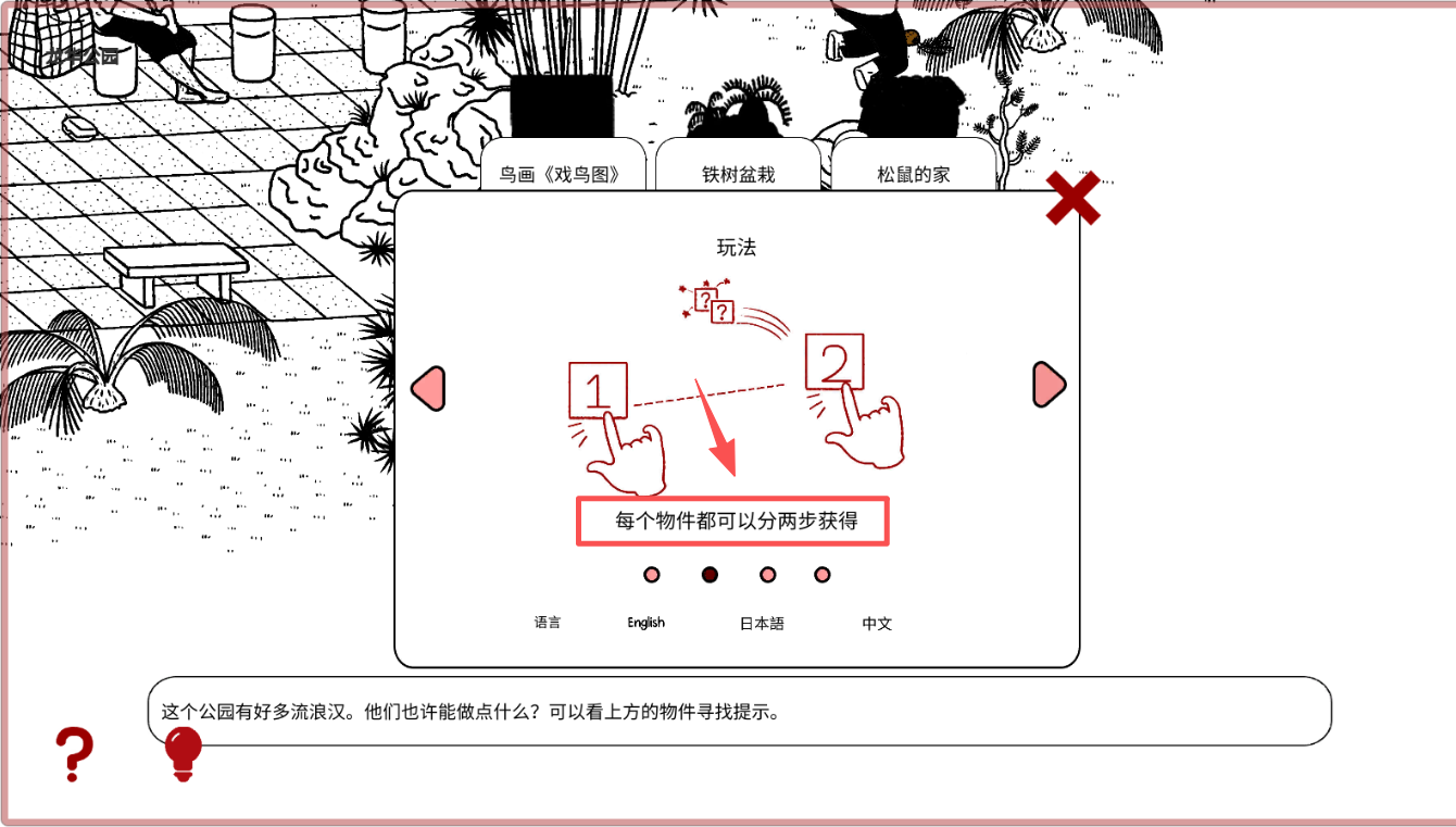 3、观察场景中的鸟画戏鸟图,点击获取线索,了解公园内隐藏的秘密。