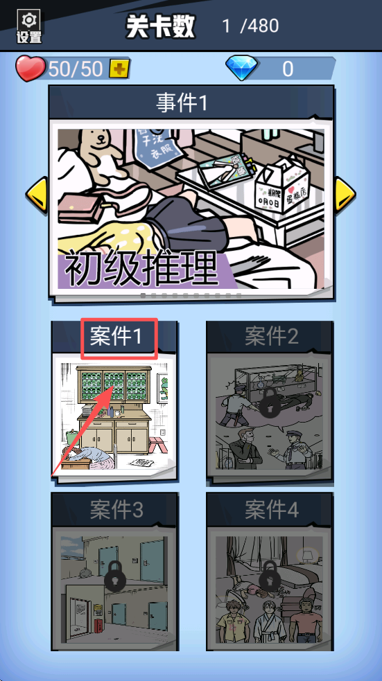 2、在案件列表中点击“案件1”按钮,选择你要调查的案件。