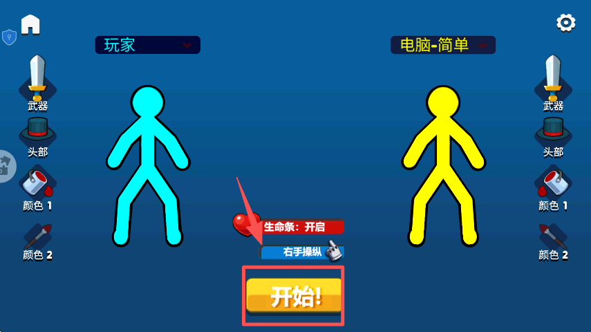 3、在游戏设置中选择角色颜色和武器,点击“开始”按钮进入游戏。