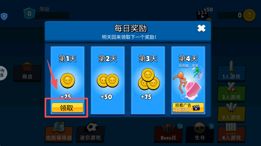 1、点击“每日奖励”领取金币,第一天可领取25金币。