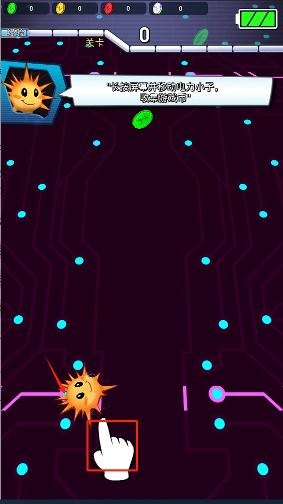 1、进入游戏后,长按屏幕并移动手指,控制电力小子收集游戏币。