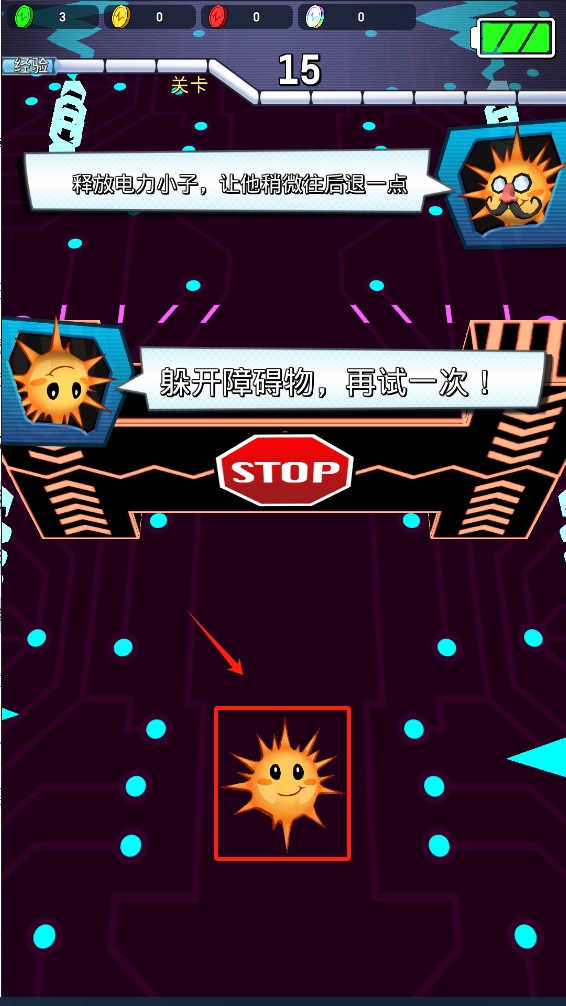 3、遇到障碍物时,松开手指让电力小子后退,躲避障碍。