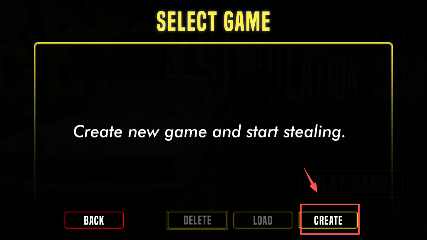 2、在“SELECT GAME”界面,点击“CREATE”创建新游戏。