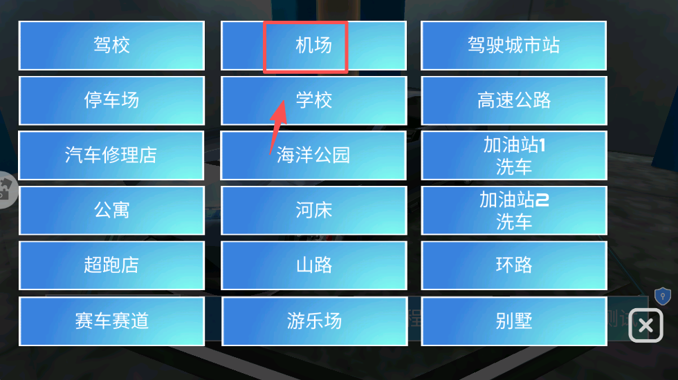 2、点击“机场”等不同场景选项,选择你想要模拟驾驶的环境。
