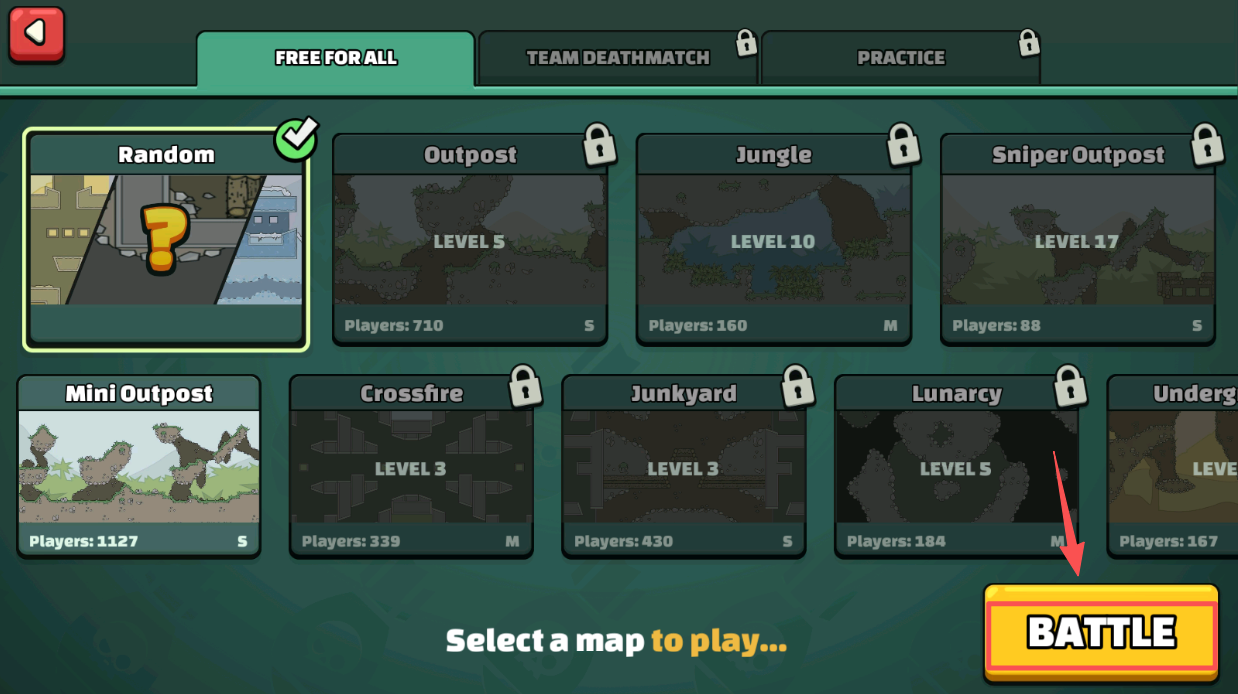 2、选择地图,在地图选择界面,点击“BATTLE”进入战斗。