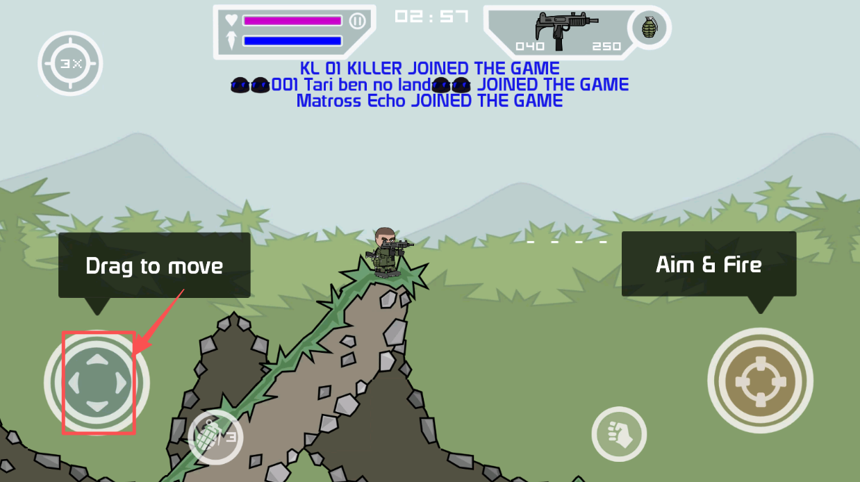 4、控制角色,在游戏内,拖动虚拟摇杆控制角色移动,点击进行射击。
