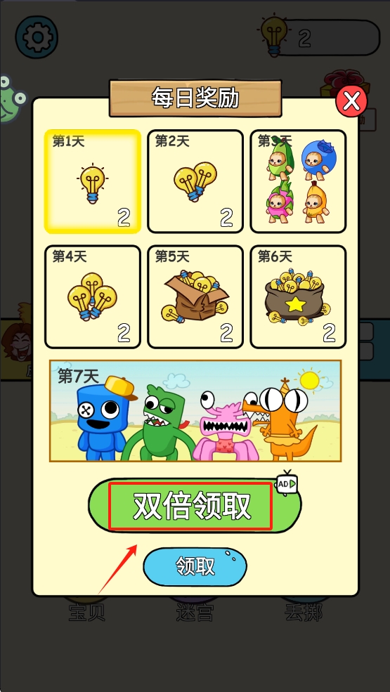 1、查看每日奖励,点击领取按钮,获取每日奖励,积累游戏资源。