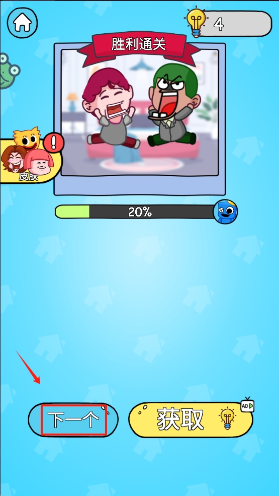 4、通过关卡,点击“下一个”按钮,继续游戏,挑战下一关,赢取胜利。