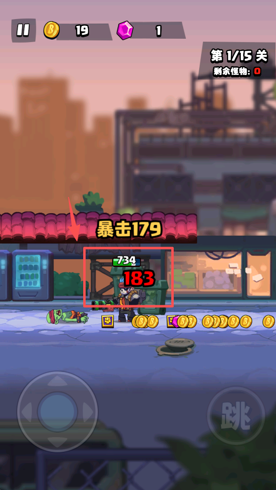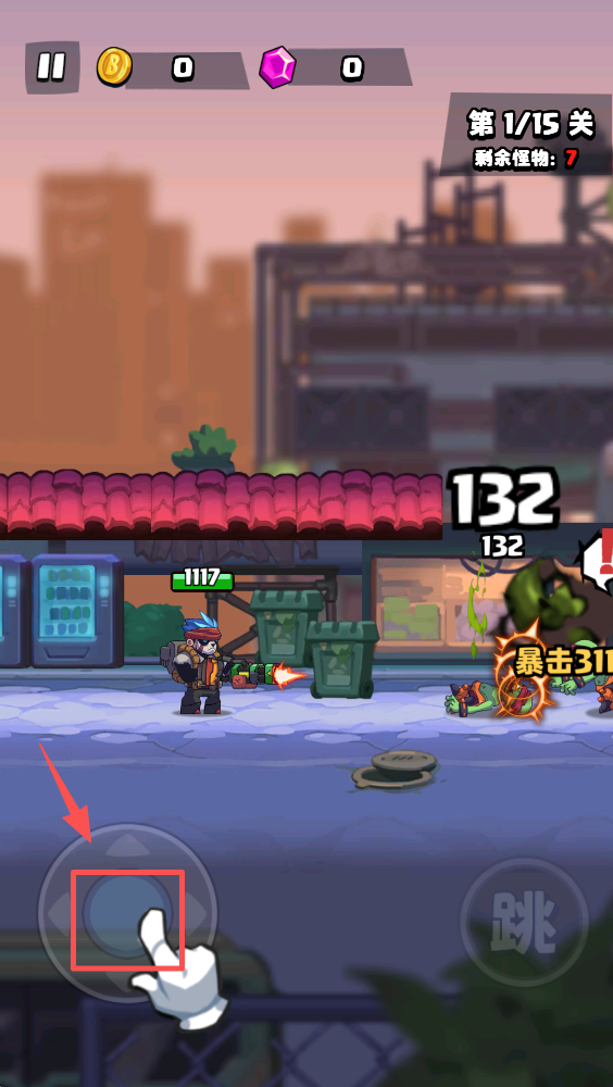 1、点击虚拟摇杆,控制角色移动,避开障碍物和敌人攻击,确保角色安全。