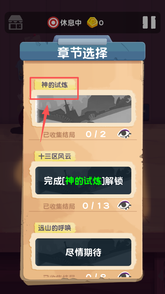 1、在游戏主界面中,选择你想要进行的章节,例如“神的试炼”。