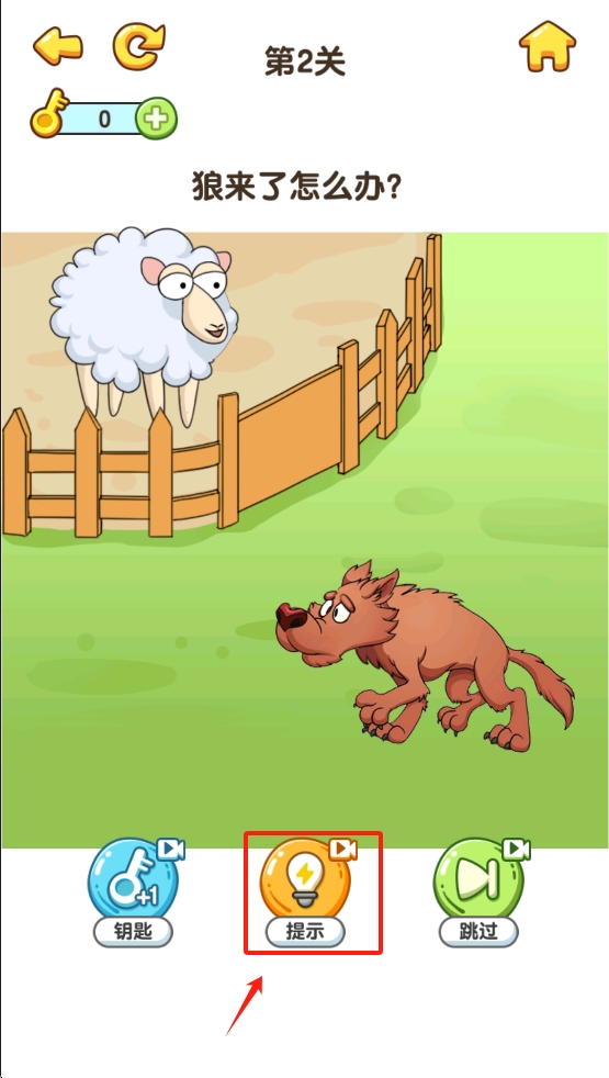 2、在第2关界面,点击中间的“提示”按钮,获取解决问题的线索。