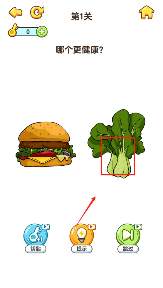 1、在第1关界面,点击右侧的绿色蔬菜图标,选择健康的食物选项。