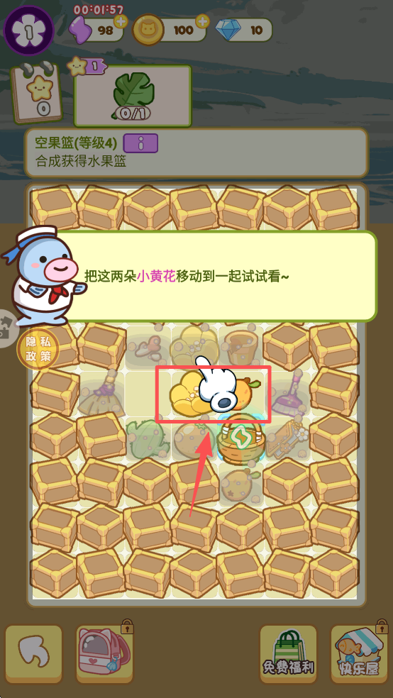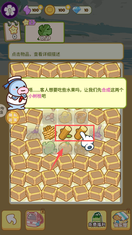 4、按照游戏指导,将两个相同的物品移动到一起进行合成,获取更高级别的物品。