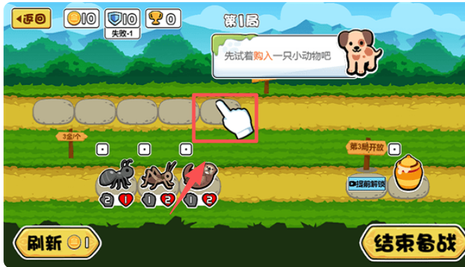 1、对局开始后,玩家可从随机出现的动物中挑选购买,并安排它们在棋盘战场上的站位,以应对不同阶段的对手。