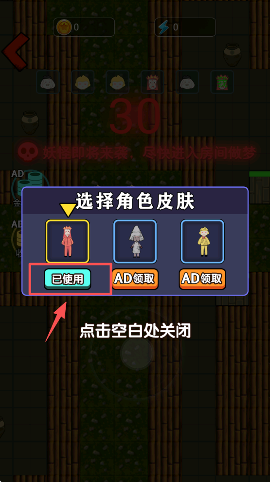 3、然后,在角色皮肤选择界面,点击“已使用”按钮,选择你喜欢的角色皮肤进行游戏。
