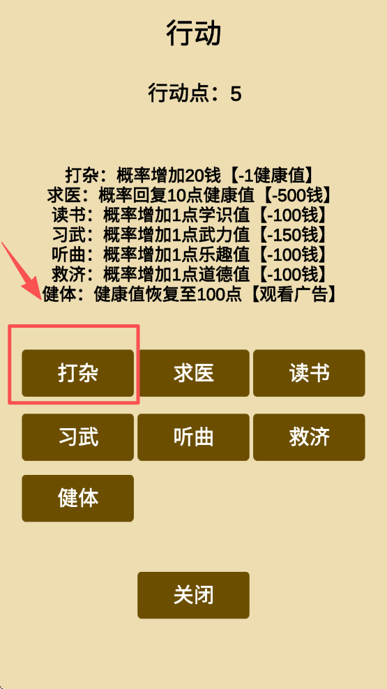 3、在行动选择界面,点击“打杂”按钮,开始通过行动获取资源和经验。