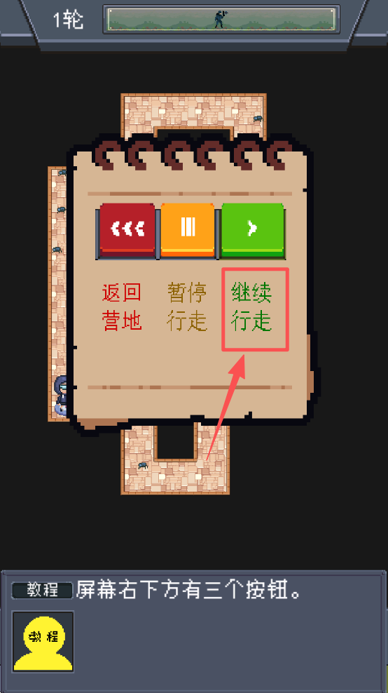 4、最后,点击“继续行走”按钮,让角色继续前进,进行下一步行动。