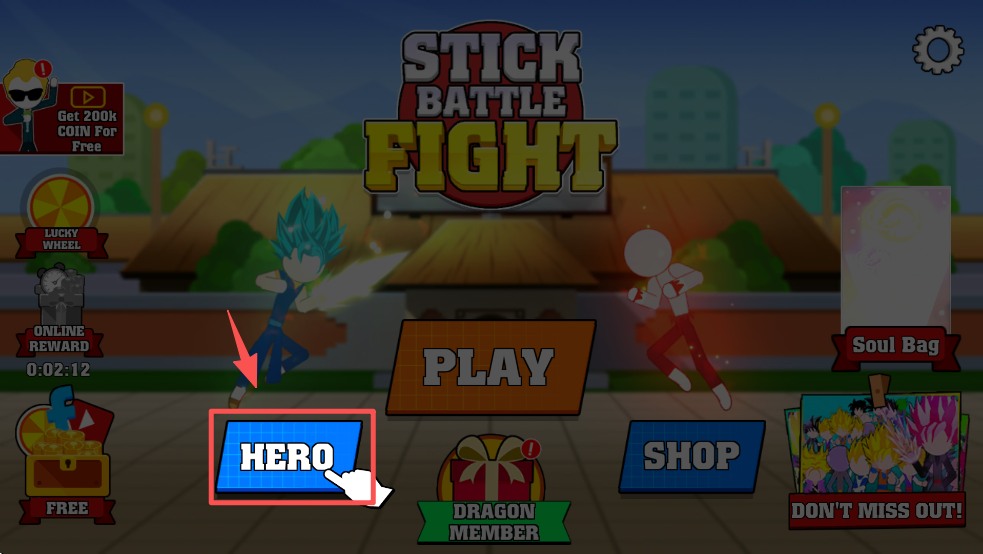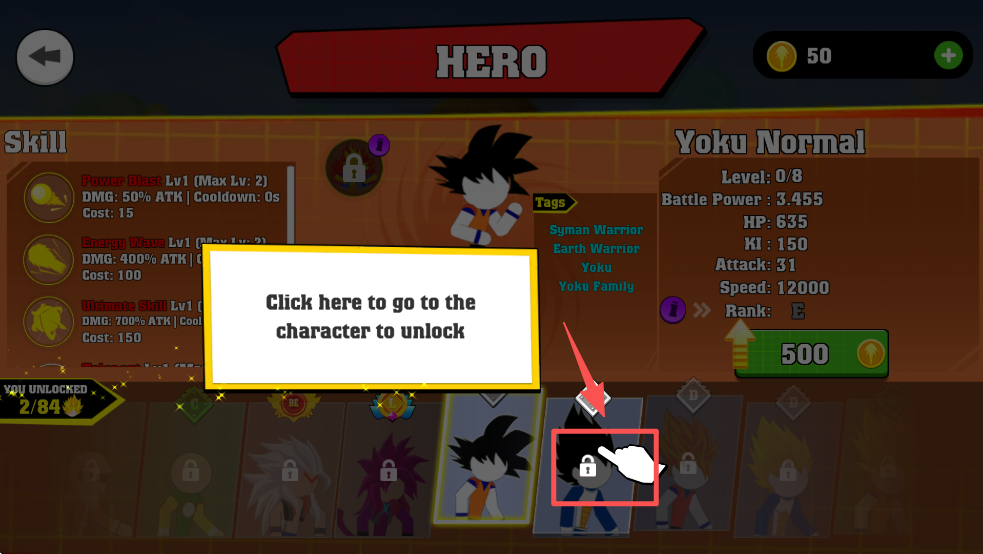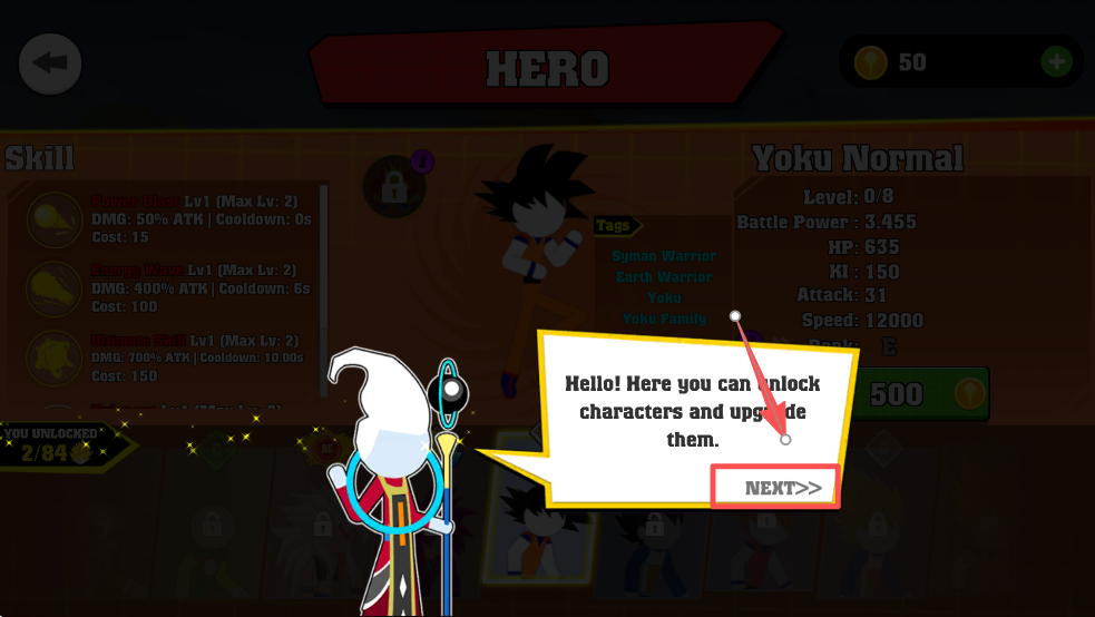 1、点击主界面的“HERO”按钮,进入角色选择界面,查看可解锁的角色。